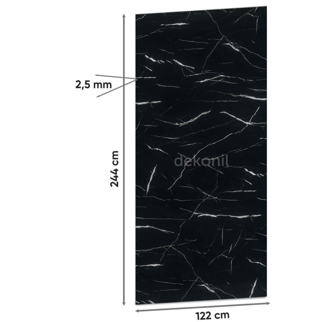 Black White mermer desenli PVC duvar paneli, siyah zemin üzerindeki beyaz damarlarıyla güçlü ve modern bir görünüm sunar. 122×244 cm boyutundaki bu panel, suya dayanıklı yapısıyla banyo, mutfak ve yaşam alanları için ideal bir dekoratif çözümdür.