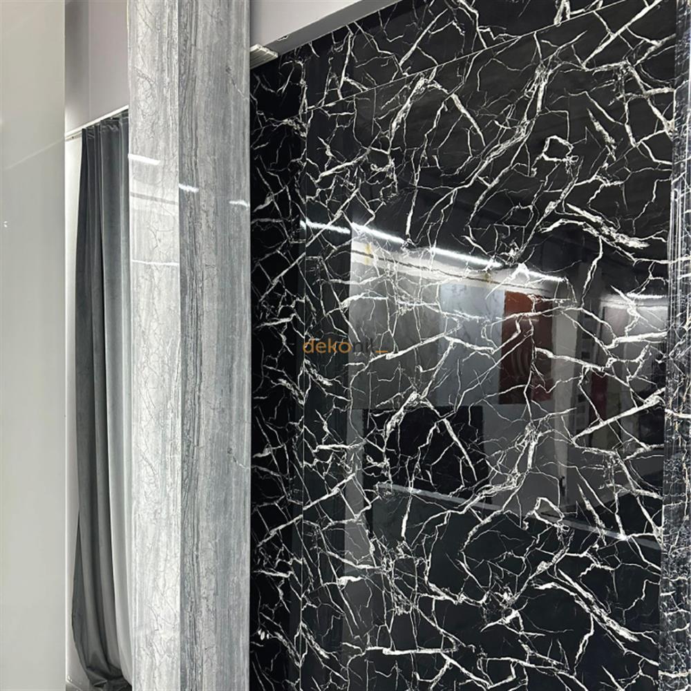 Black White Mermer Desenli PVC Duvar Paneli 60×120 cm, iç mekan dekorasyonunda estetik ve fonksiyonelliği bir araya getirir. Parlak siyah zemin üzerindeki doğal mermer damar desenleriyle dikkat çeken bu panel, salon, yatak odası, banyo veya TV ünitesi arkası gibi alanlarda lüks bir atmosfer yaratır.