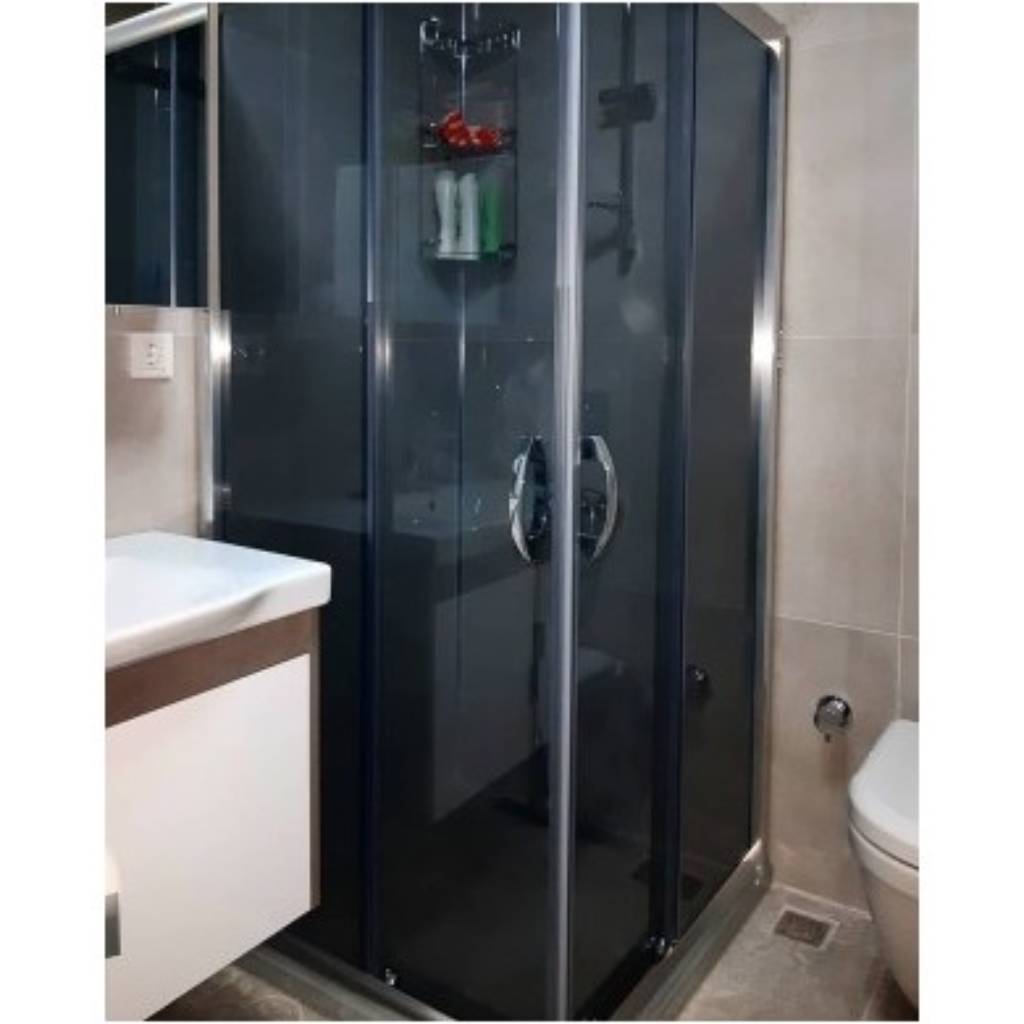 Duşakabin şık ve kullanışlı. 5mm temperli füme, parlak profil ve 120-120 ölçülerinde estetik ve sağlam bir kare kabin duşakabin. Yükseklik: 190 cm.