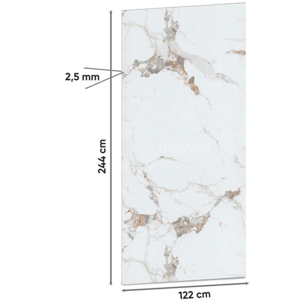 White Rock mermer desenli PVC duvar paneli, zarif beyaz dokusu ve gri damar detaylarıyla iç mekanlara ferahlık ve şıklık katar. 122×244 cm ebatında, 2,5 mm kalınlığında, suya ve neme dayanıklı bu panel, banyo, mutfak ve tüm yaşam alanları için idealdir.